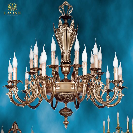 • Chất liệu: Đồng mạ vàng kết hợp pha lê Asfour cùng chao đèn làm bằng lụa Organza của Italy.