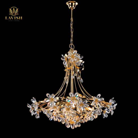 • Chất liệu: Đồng mạ vàng kết hợp pha lê Asfour cùng chao đèn làm bằng lụa Organza của Italy.